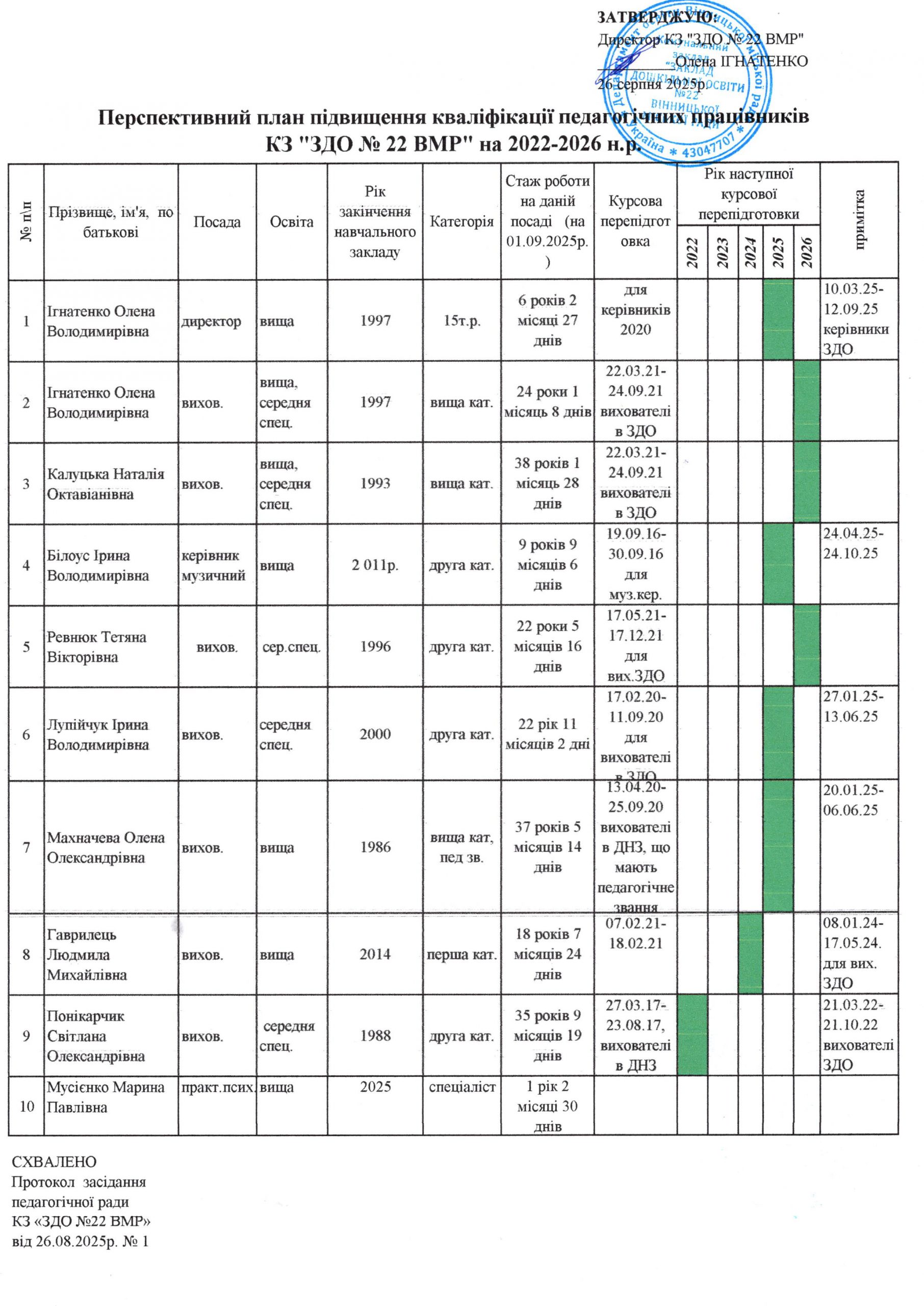 Орієнтовний план підвищення кваліфікації педагогічних працівників КЗ «ЗДО № 22 ВМР» на 2026рік